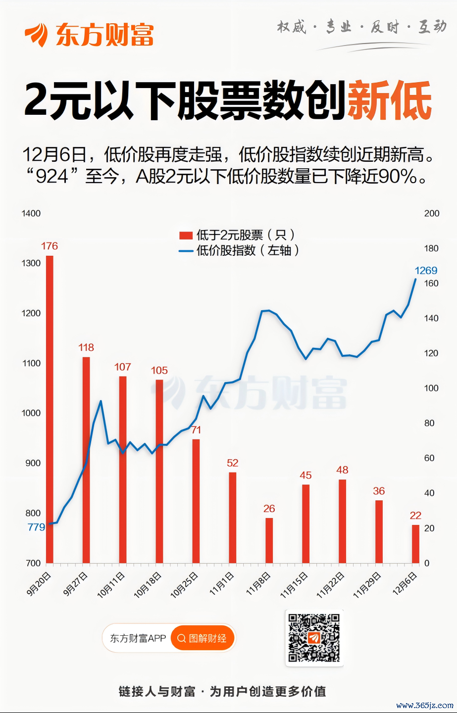 低价股指数大涨的同时,低价股群体也在被批量“消灭”。数据显示,9月23日,A股5元以下的股票数高达1233只,而截至12月6日收盘,5元以下的股票数已降至611只,正规配资平台_最好的配资公司_专业的股票配资总数直接腰斩。同期,“极端”低价股数量降幅更大,2元以下的低价股从174只降至22只,降幅接近90%。